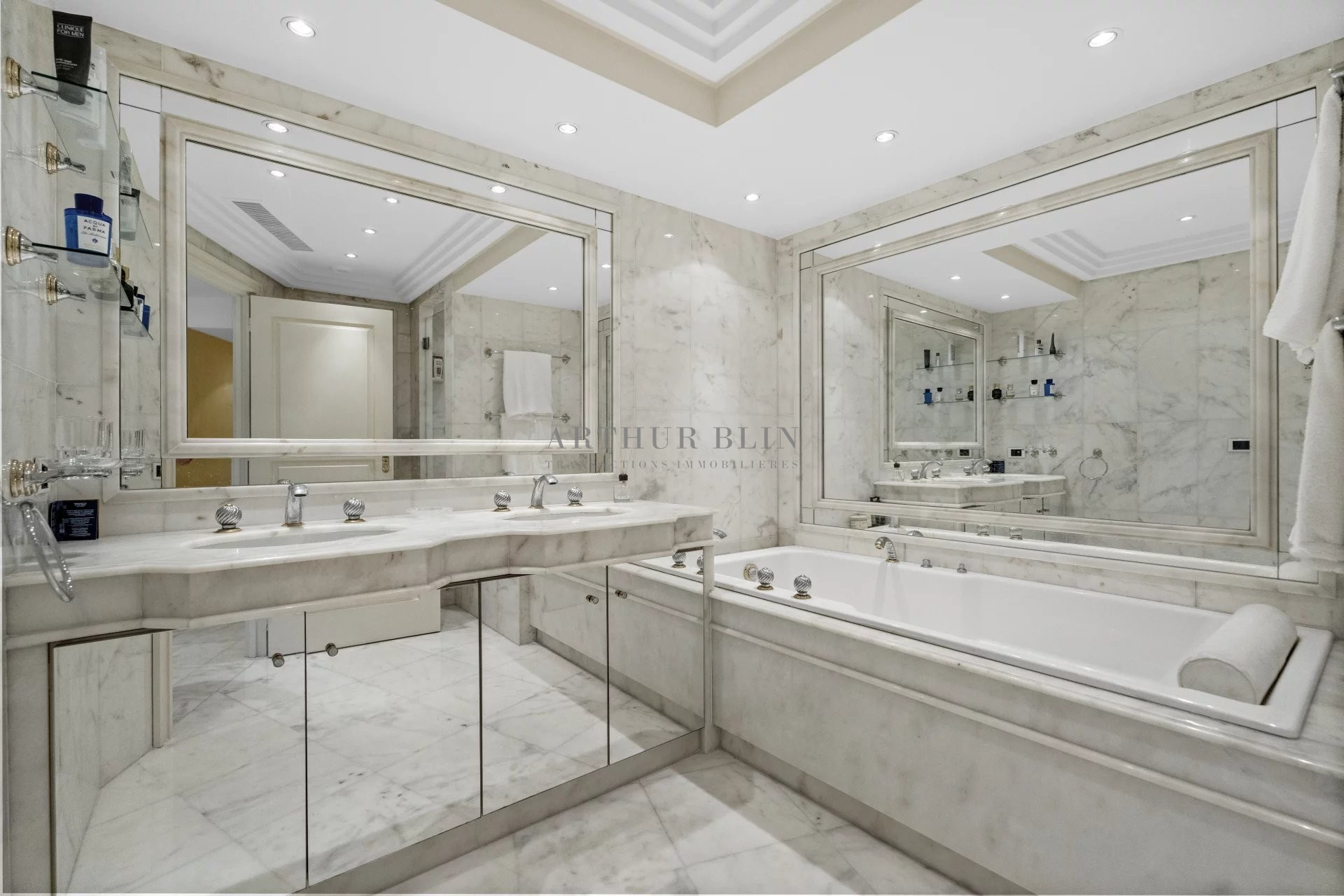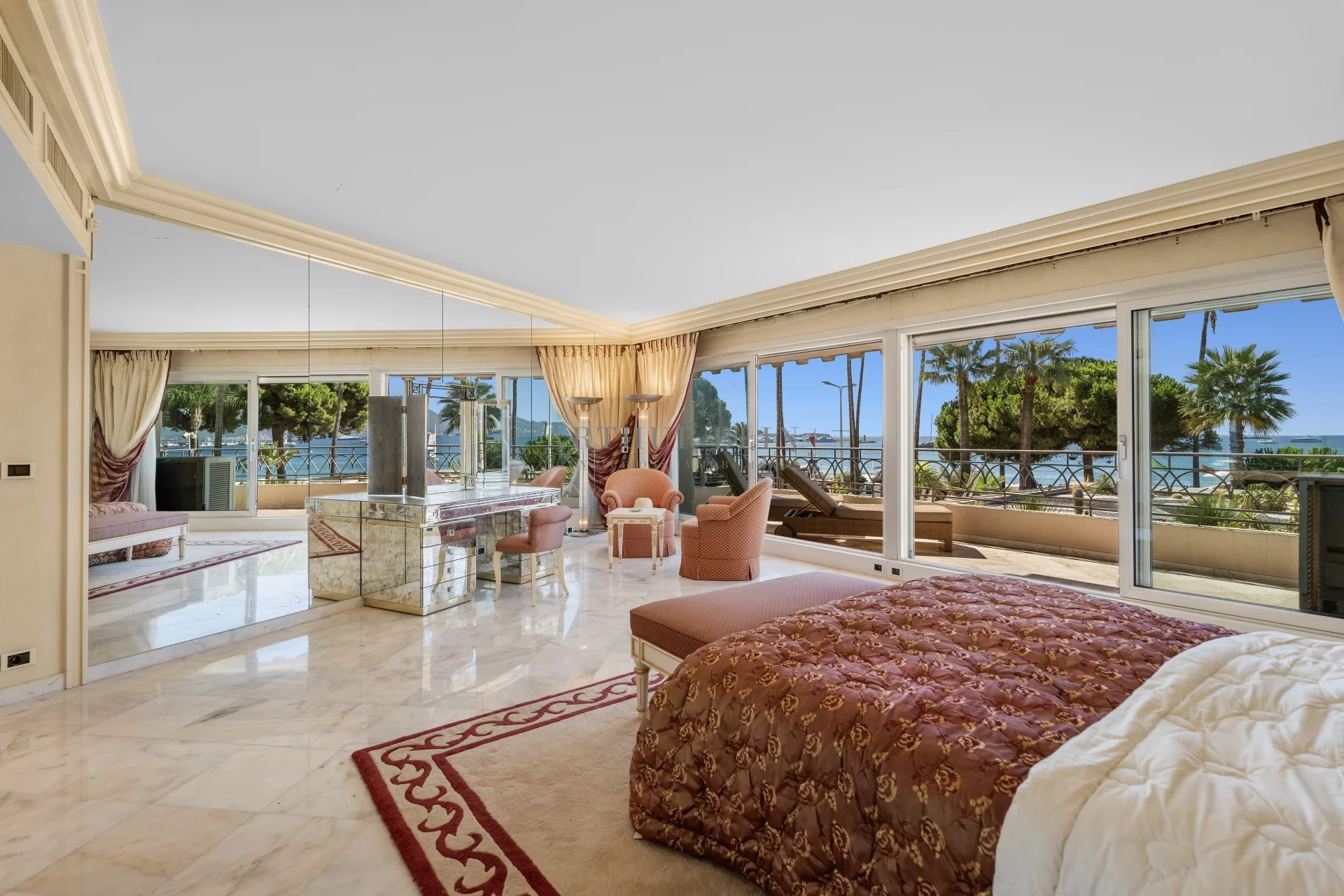A Cannes, sur le Boulevard de La Croisette, entre les hôtels Carlton et Martinez, dans la résidence de grand standing MIRAMAR avec gardien et service de sécurité 24/24h et 7/7j, superbe appartement traversant de 4 pièces principales d'une superficie de 245 m2 et avec studio attenant de 33 m2.Hall d'entrée, superbe living ouvrant sur une terrasse plein Sud avec vue sur la Croisette et la mer, cuisine séparée avec fenêtre sur la mer, arrière cuisine/buanderie, vaste chambre de maître avec salle de bains complète, et coté jardin intérieur, deux belles chambres ouvrant chacunesur un balcon au calme et leur salle de douches.Un studio attenant composé d'une entrée avec placards, de la pièce principale ouvrant sur la terrasse coté jardin, une cuisine séparée et une salle de bains. Un double garage en sous-sol d'une résidence voisine. Délégation.