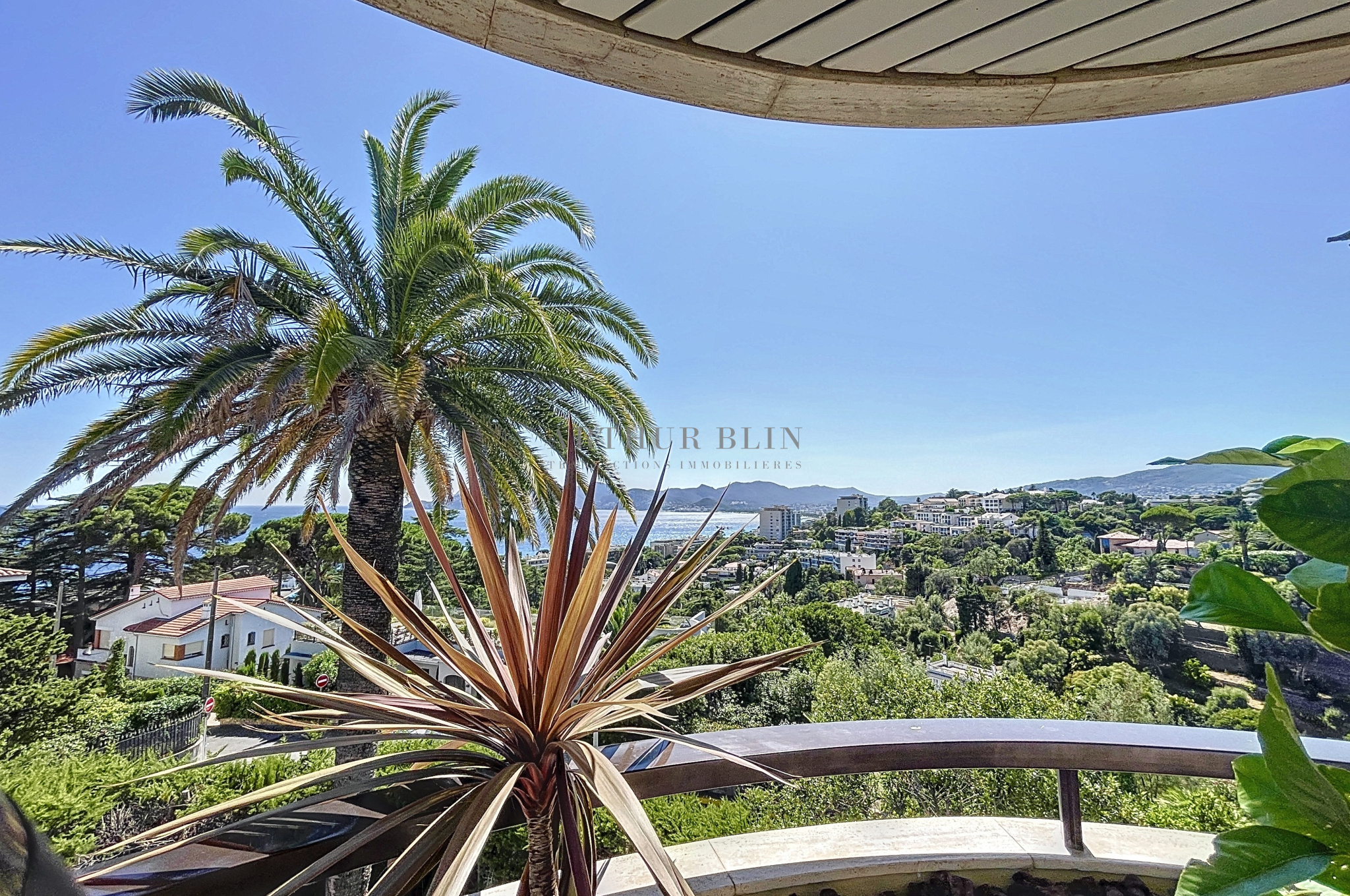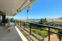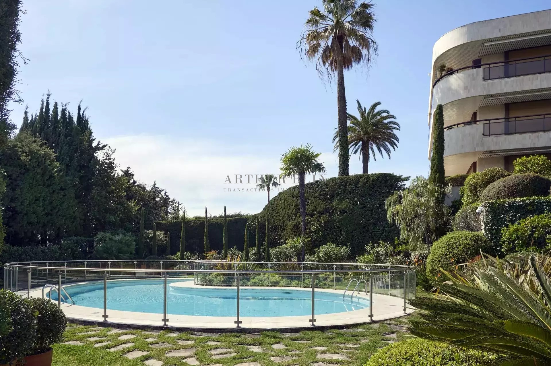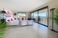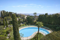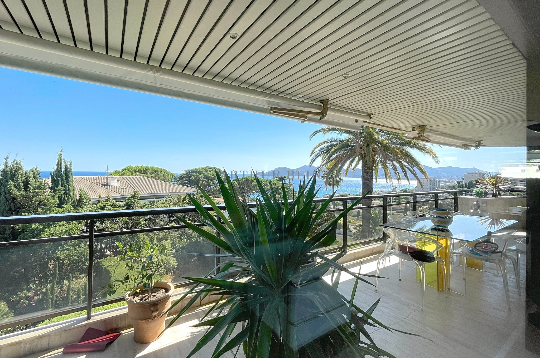 CO-EXCLUSIVITE. Dans une résidence sécurisée avec réception, superbe parc paysager, grande piscine et tennis, en dernier étage, vaste appartement d’env. 180 m2 avec belle vue mer et Iles de Lérins. Hall d’entrée, vaste living ouvrant sur une belle terrasse profonde à la vue mer, salle-à-manger, cuisine, grande chambre de maître ouvrant sur une terrasse et avec salle de bains et dressing, une deuxième chambre avec terrasse et salle de bains attenante avec dressing L’appartement disposait avant de 3 chambres dont 2 ont été réunies en une seule qui est la chambre de maître actuelle. Une cave. Deux grands parking dans le garage de la résidence.