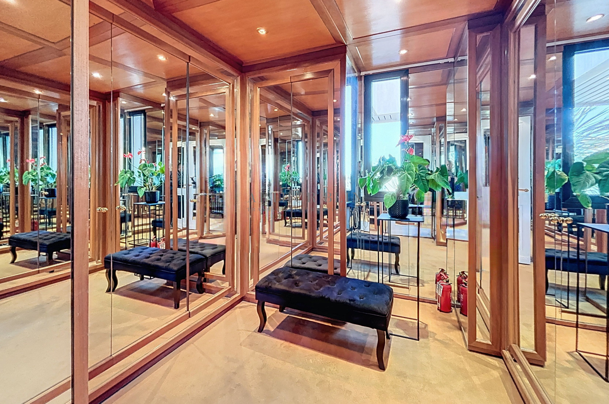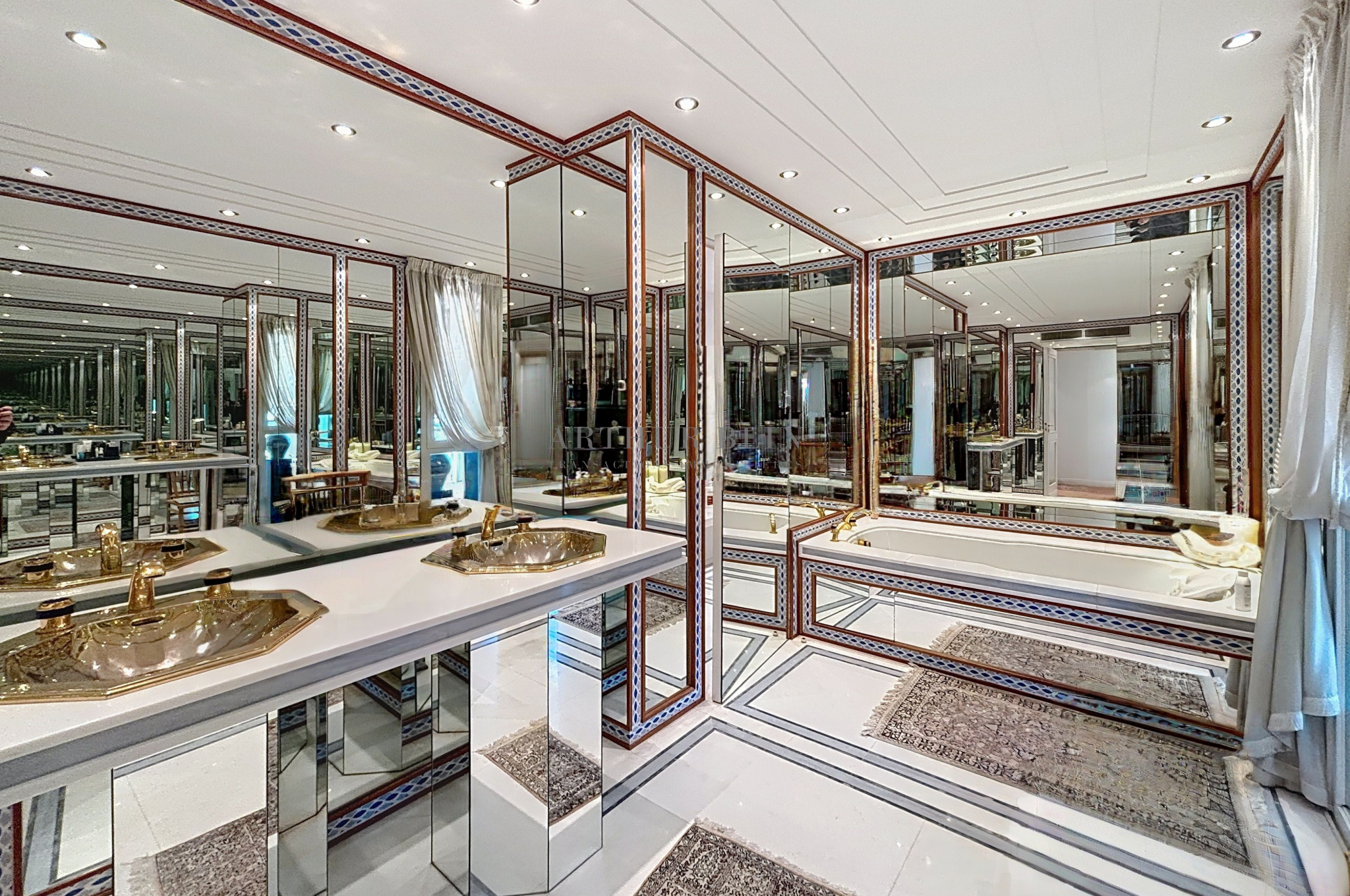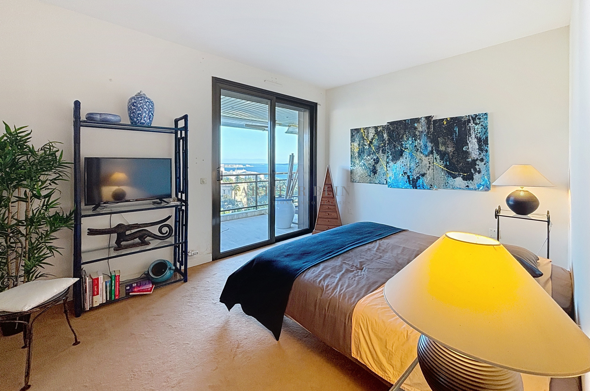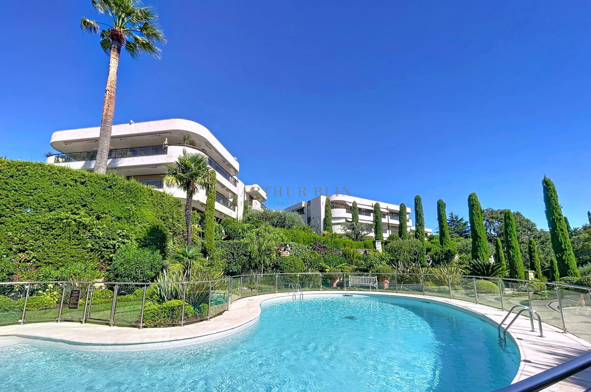 CO-EXCLUSIVITE. Dans une résidence sécurisée avec réception, superbe parc paysager, grande piscine et tennis, en dernier étage, vaste appartement d’env. 180 m2 avec belle vue mer et Iles de Lérins. Hall d’entrée, vaste living ouvrant sur une belle terrasse profonde à la vue mer, salle-à-manger, cuisine, grande chambre de maître ouvrant sur une terrasse et avec salle de bains et dressing, une deuxième chambre avec terrasse et salle de bains attenante avec dressing L’appartement disposait avant de 3 chambres dont 2 ont été réunies en une seule qui est la chambre de maître actuelle. Une cave. Deux grands parking dans le garage de la résidence. Les informations sur les risques auxquels ce bien est exposé sont disponibles sur le site Géorisques