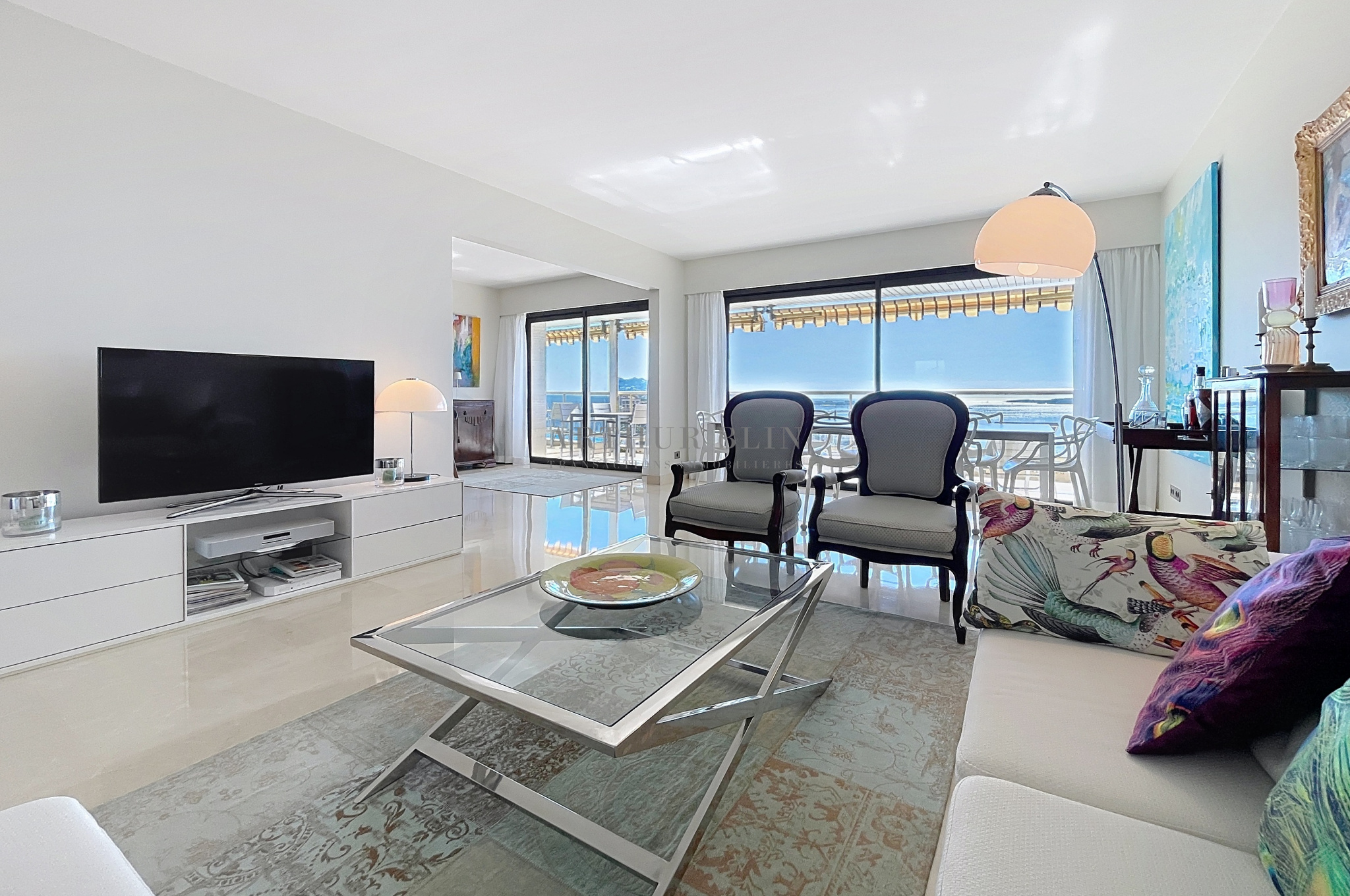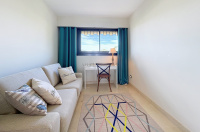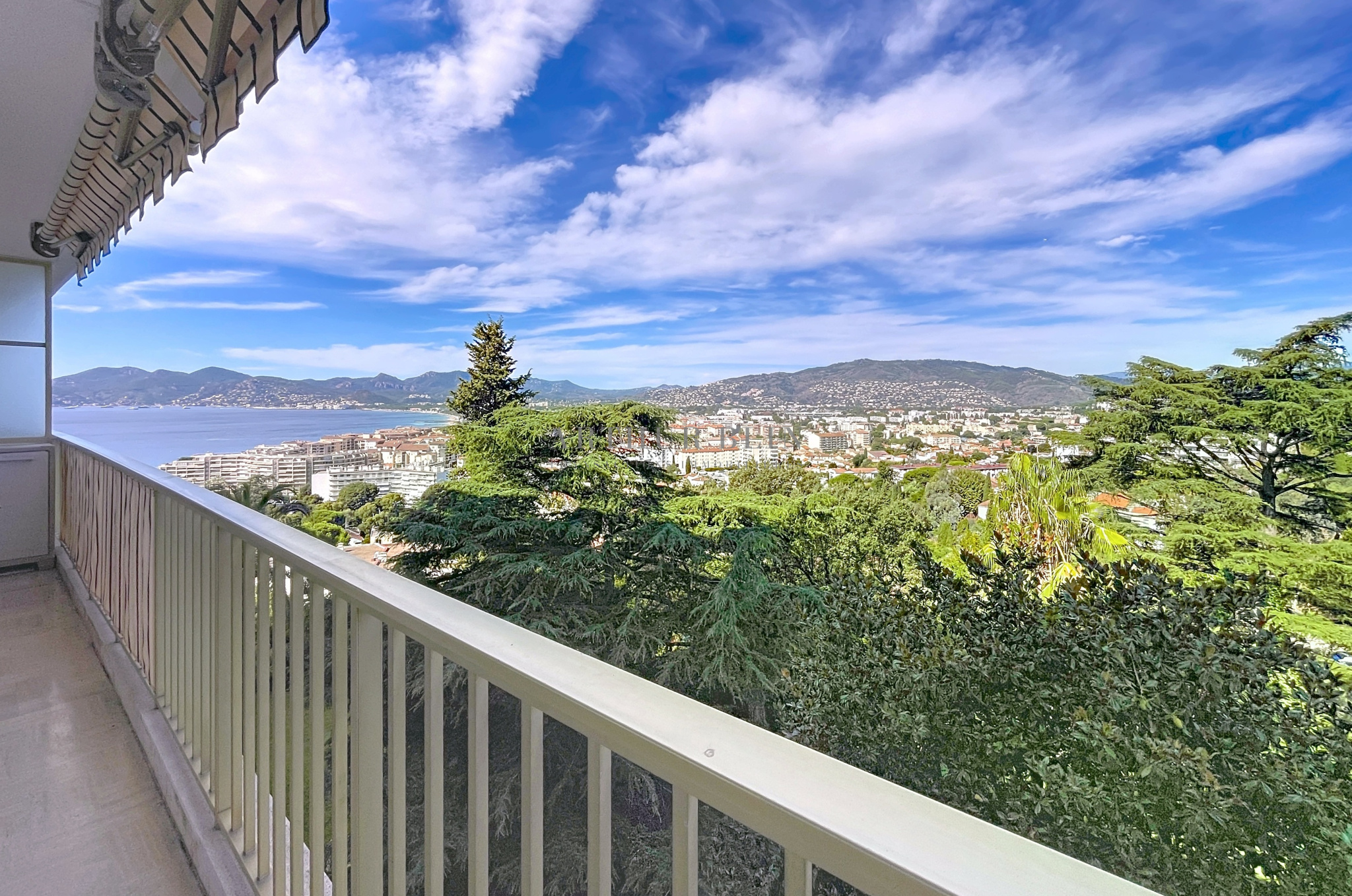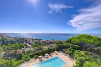 Dans une des plus belles résidences du secteur recherché résidentiel de la Croix-des-Gardes, avec gardien / réception, superbe parc paysager, tennis et très grande piscine, en étage élevé, bel appartement à la vue mer spectaculaire à 180 degrés embrassant toute la baie de Cannes. Hall d'entrée avec penderies, double living (45 m2) avec belle cuisine intégrée ouvrant sur la terrasse à la vue panoramique principale et à l'arrière une vaste chambre avec penderies et salle de bain attenante avec WC, une seconde chambre, une seconde salle d’eau avec WC. Rangements. L'appartement est en parfait état. Une cave et un garage privatif. Parkings visiteurs.